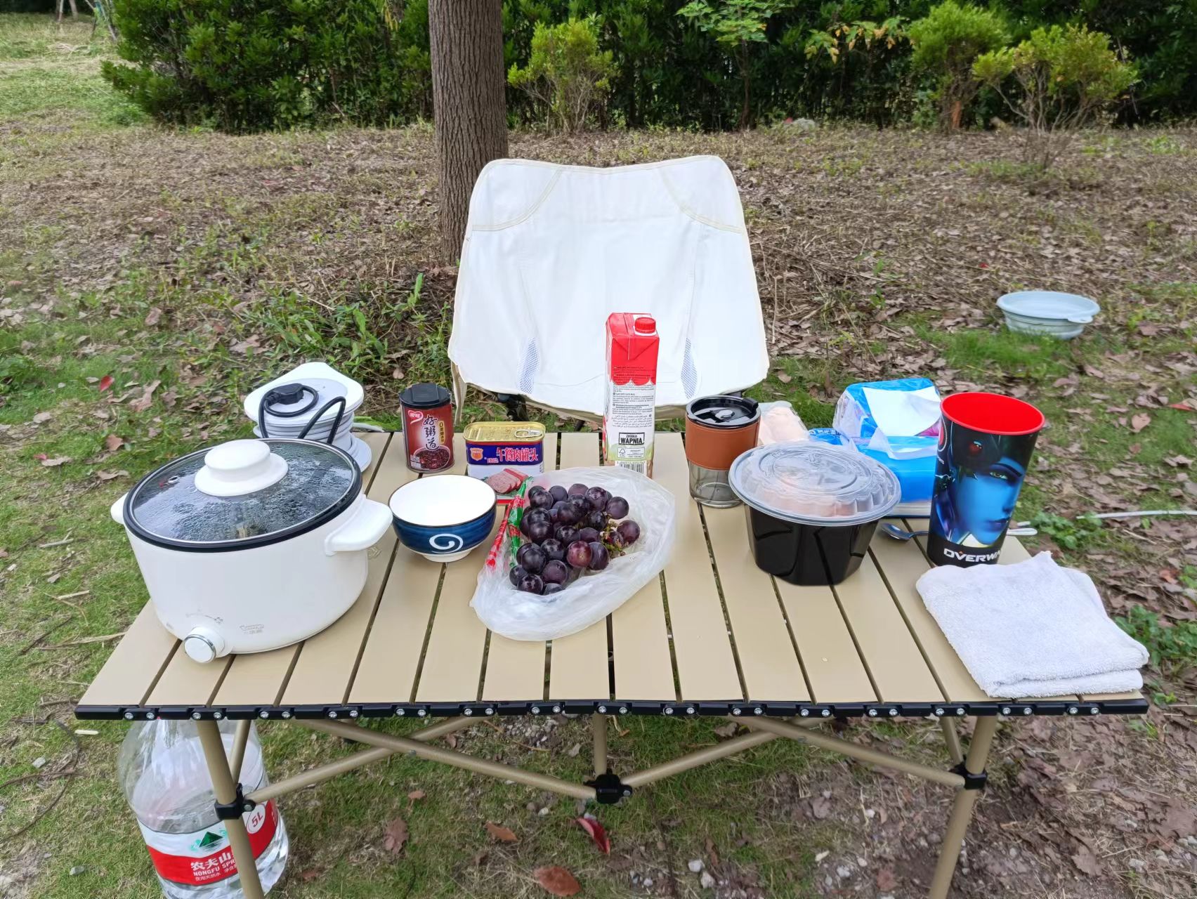 早上起来洗漱收拾做早餐,由于起来比较晚,太阳已经出来了,就把桌子给移到了树荫下,之前特地买了一个10米长的拖线板,这样远一点用电也没关系。吃的比较简单,煮粽子煎鸡蛋,还有带来的八宝粥和牛奶,做饭都用电,电是完全够用了