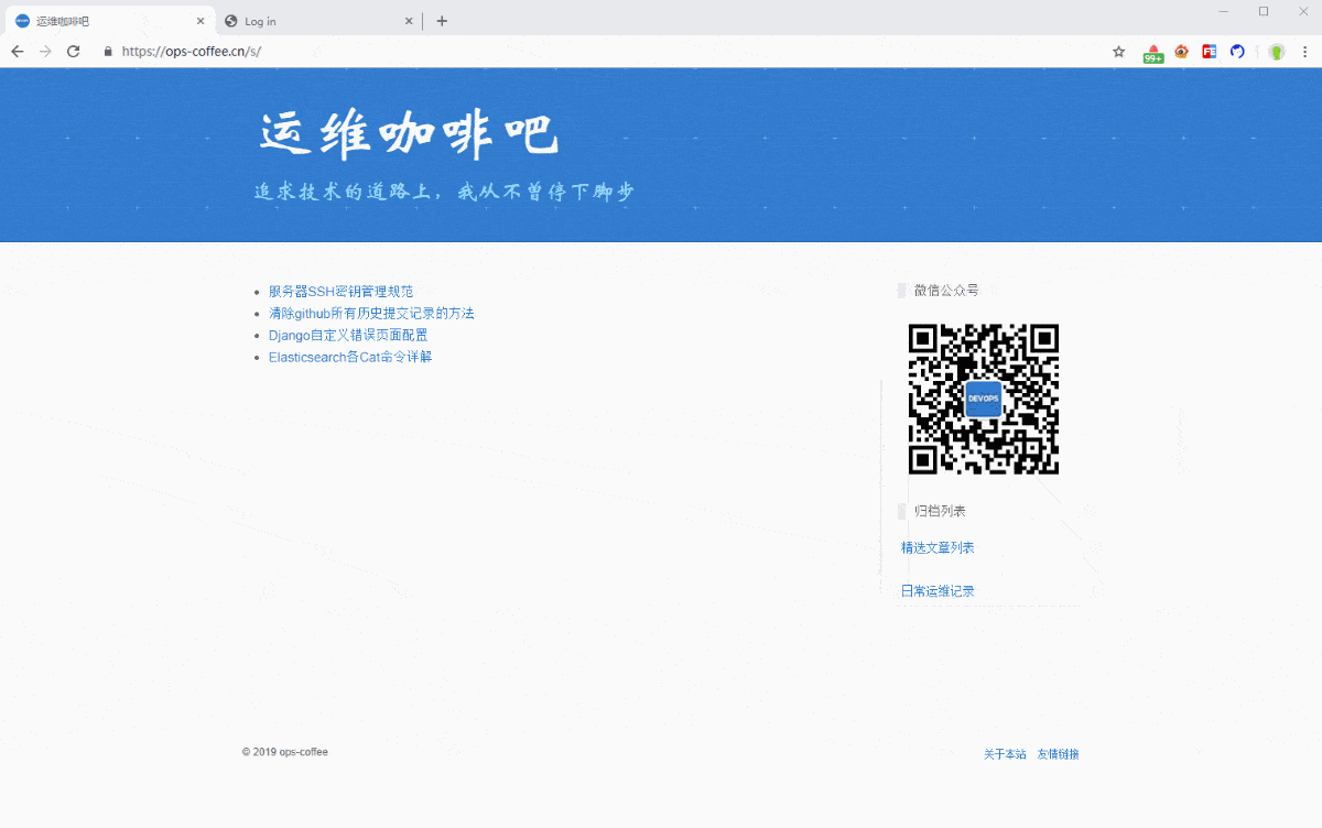 曾经多次在不同的平台写博客,但全部都以失败而告终。去年七月选择微信公众号做为平台开始了又一次的技术分享,庆幸一直坚持到现在,但随着文章发表的越来越多,发现公众号对于PC端很不友好,文章列表没有PC端入口,查看分享很不方便,所以就利用github pages搭建了一个【运维咖啡吧】的网站,分类展示公众号内发表的所有文章以及一些未在公众号发表的琐碎内容