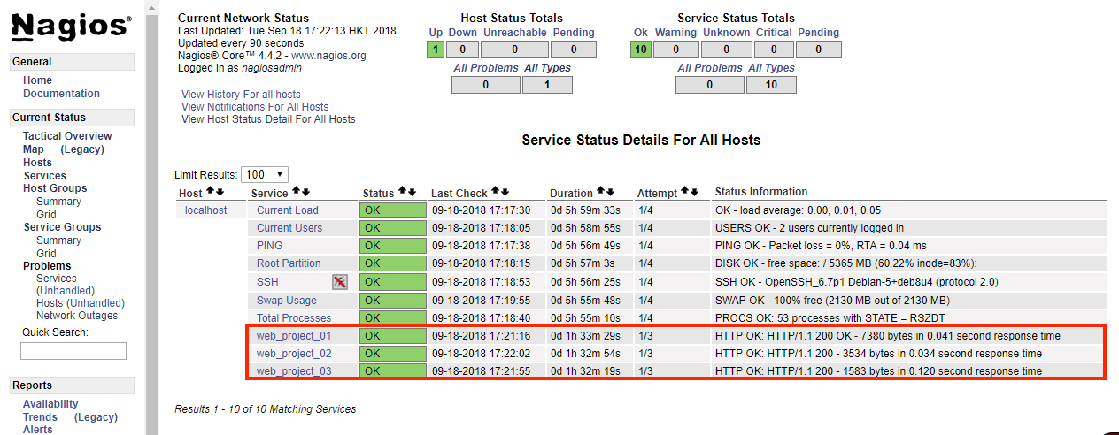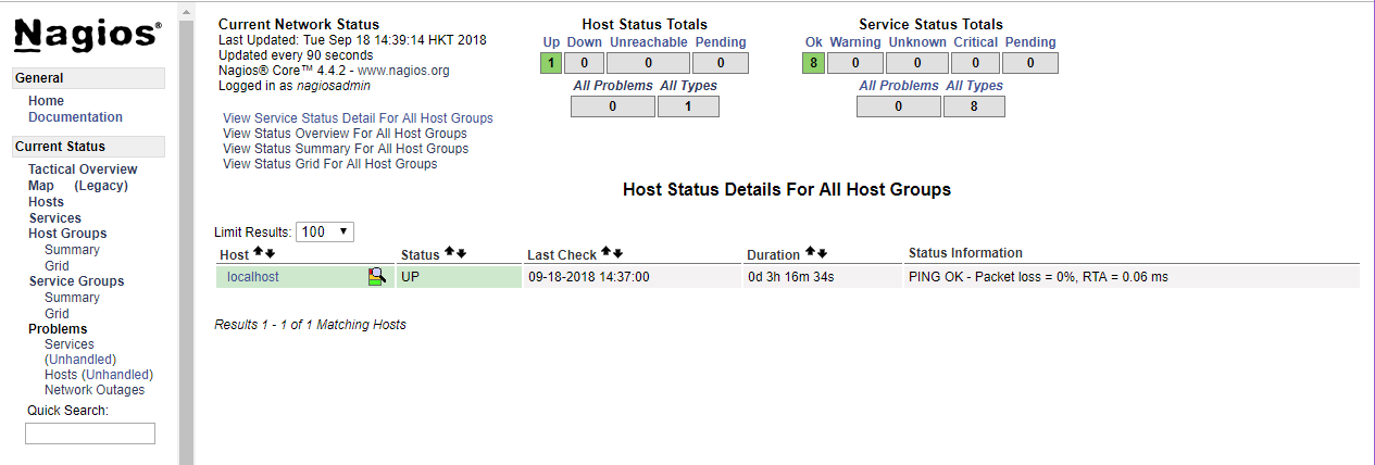 7.浏览器访问服务器IP或域名就可以看到nagios的页面了,默认有本机的监控数据,不需要的话可以在配置文件localhost.cfg中删除