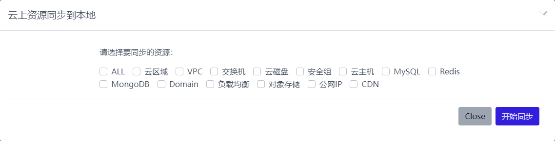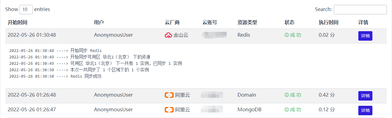 资源同步是个耗时的操作,并且需要不停的去同步,以保证本地资源属性的准确,所以对于资源同步借助于Celery的异步任务和定时任务来完成,默认每半小时会全量同步一下云上资源,所以本地资源跟云上资源状态会有半小时的时间差异,如果你修改了云上资源想要立即同步,也可以通过手动同步的方式主动触发同步