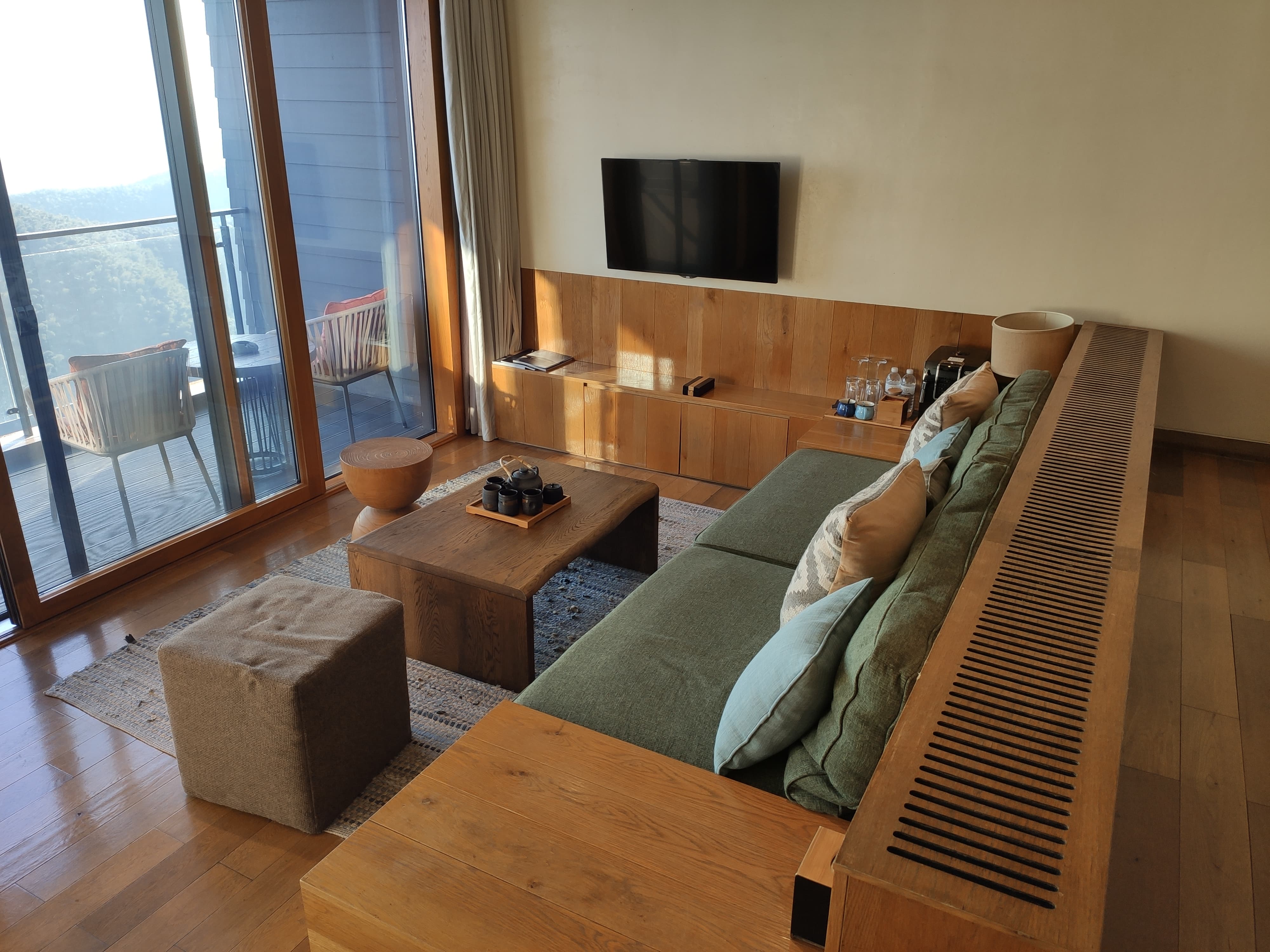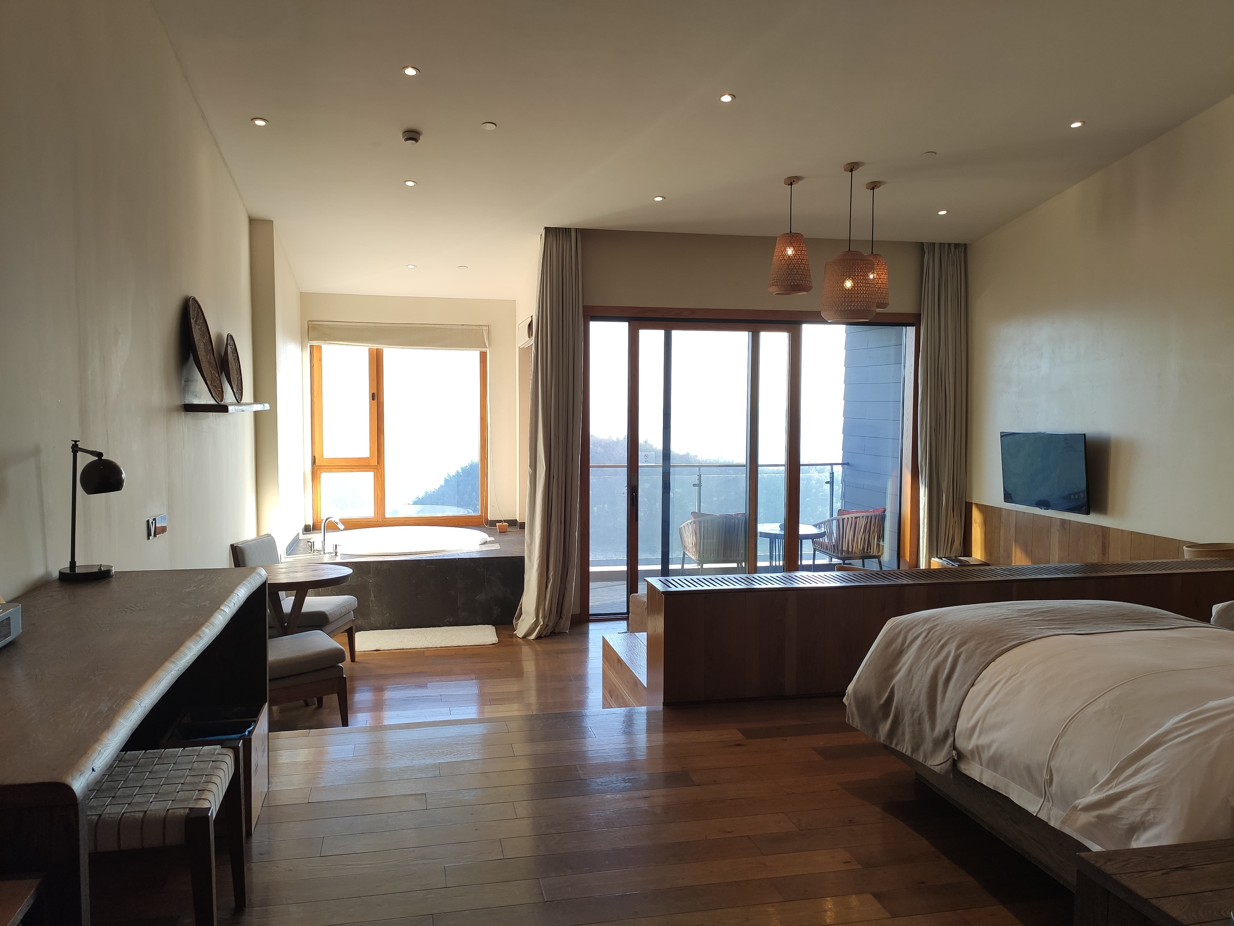 住宿除了城堡内的特色主题套房外,还包含位于城堡附近的山体上搭建的崖景房,以及由原本就有的农家小院改建的田园小居,度假村很大,所幸出门就有摆渡车,去哪里都很方便,我们有幸住在了崖景房,房间大约60平米,进门干湿分离卫生间,接着床,再下来是一个下沉式的客厅,再往外就是浴缸和阳台,视野超棒,无论是坐在客厅还是阳台亦或是泡在浴缸里都能看到连绵的群山,一下就放空了自己,找到了度假的感觉