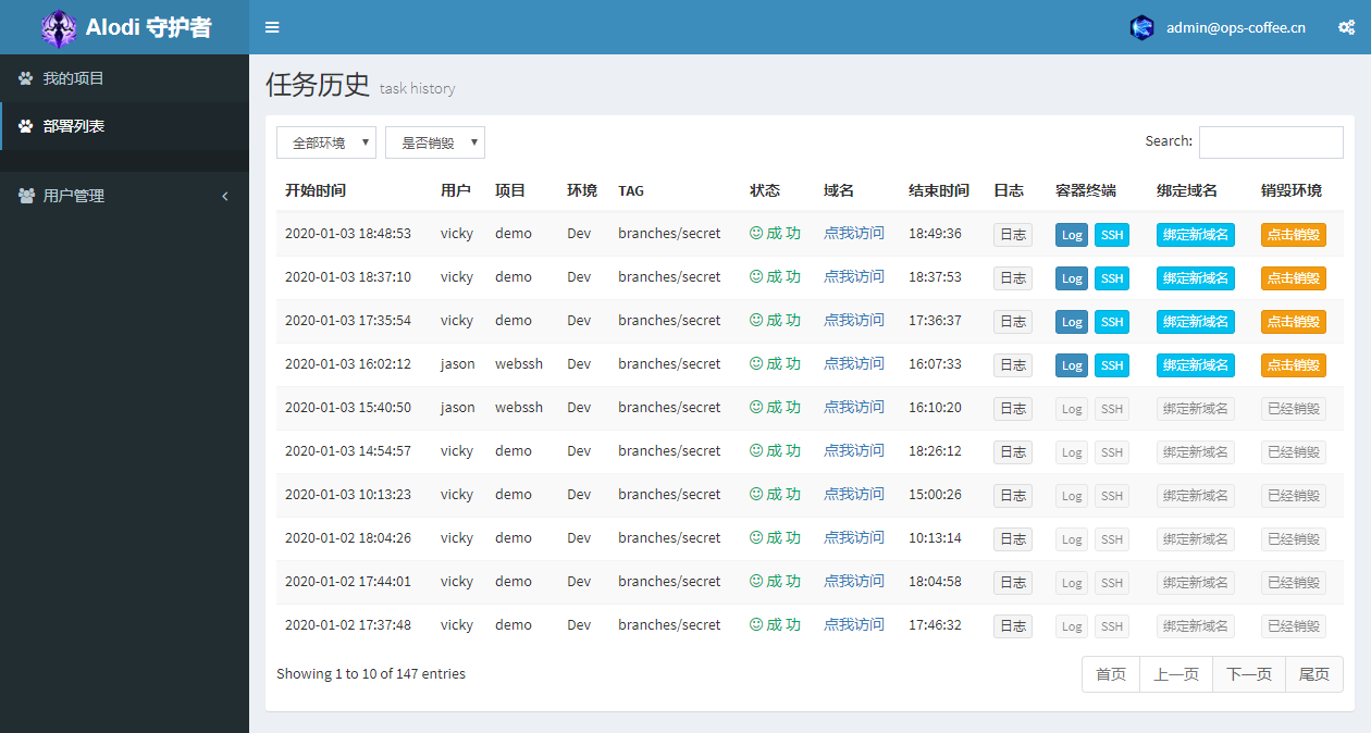 创建完成之后,可以在部署列表里找到创建环境的任务,在这里可以直接通过域名访问新创建的环境,或进行一些管理,例如创建过程中的日志查看,容器Log查看,进入容器终端排错,绑定新域名,或是销毁环境