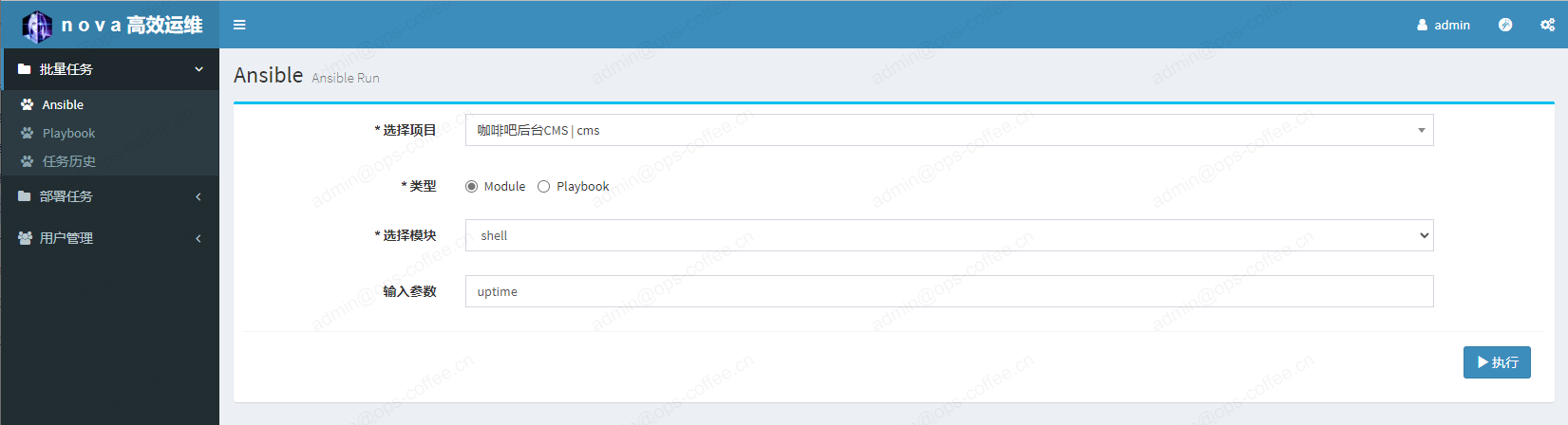 还为nova增加了批量任务执行的功能,主要基于Ansible来实现,详细介绍可以看之前的文章:Django+Ansible构建任务中心思路,借助于批量任务可以方便的进行多节点异常排查,以及非部署类的任务处理