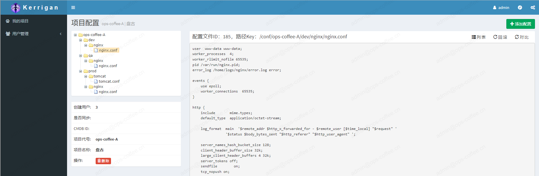 提供了完善的API。kerrigan除了管理了nginx之类的服务配置外,同时还管理了Dockerfile之类的文件,在持续集成的过程中需要用到Dockerfile,所以为Kerrigan提供了API来支持通过http的方式来获取配置文件,以便在Probius系统中使用配置文件,为此还用Python专门写了个获取配置文件的系统命令,只需要一个命令即可获取kerrigan里的配置文件,具体的实现方式可以看这里:用Python写个Linux系统命令