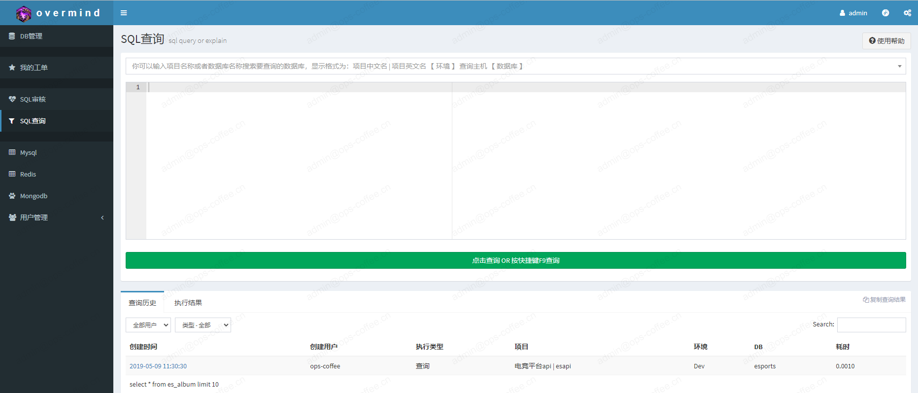 最开始写overmind系统仅仅是一个SQL审核平台,做到现在已经成了一站式DB管理系统,从工单开始,到DB信息添加,密码管理、权限管理,DB查询与审计,DB执行审核等一系列数据库相关的操作均可借助于overmind系统来完成