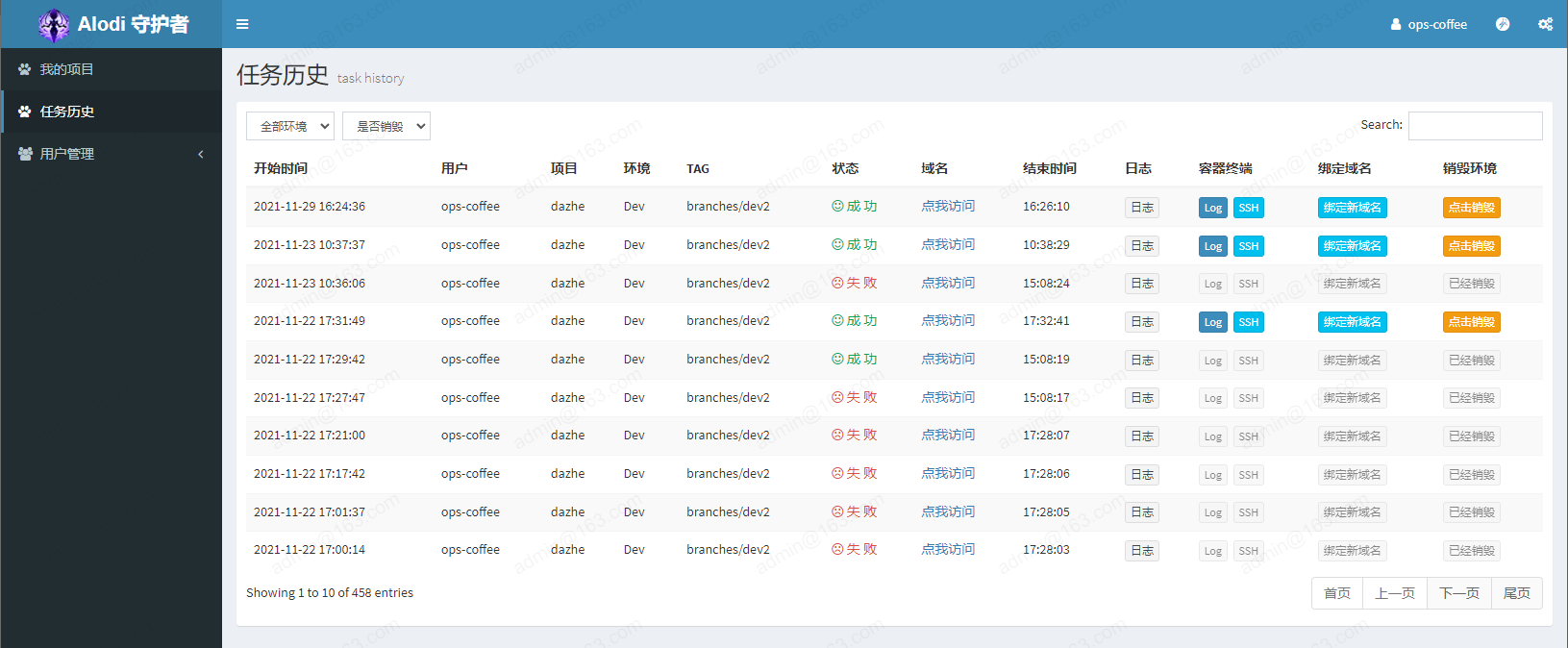 alodi系统主要用来快速生成临时环境,并实现对临时环境整个生命周期的一站式管理,主要应用在同一项目多版本同时开发测试或是保密项目不能通过常规测试环境测试的情况下使用,通过alodi可以快速的创建一个项目运行环境,通过生成的随机临时域名访问