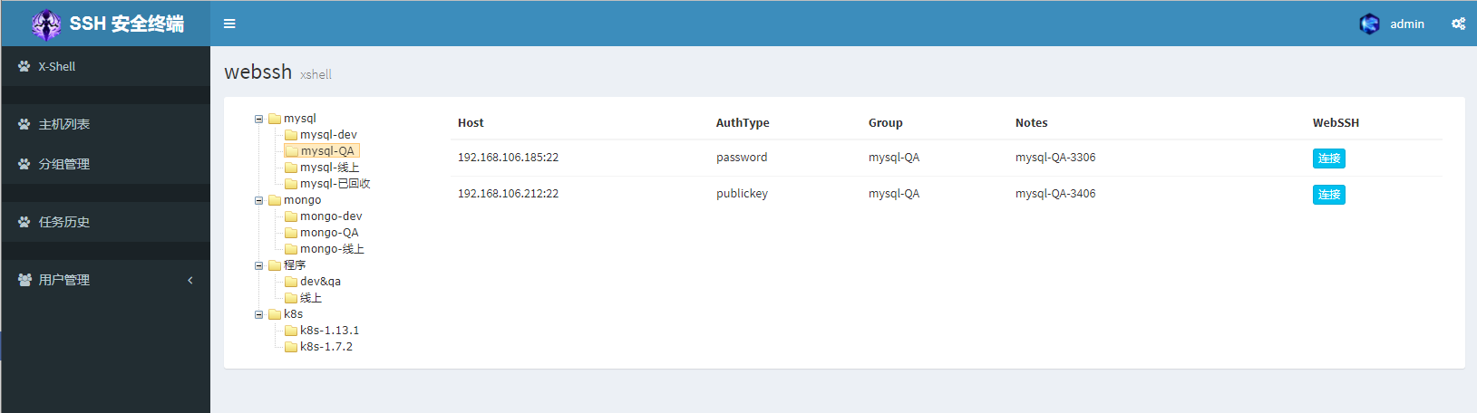 通过webssh实现堡垒机功能,通过webssh连接远程主机,可以记录会话信息,对操作进行录像,后续还可进行审计,同时也可以实时查看其他用户的操作过程,提取操作命令等,为了方便使用,还通过目录树增加了分组功能