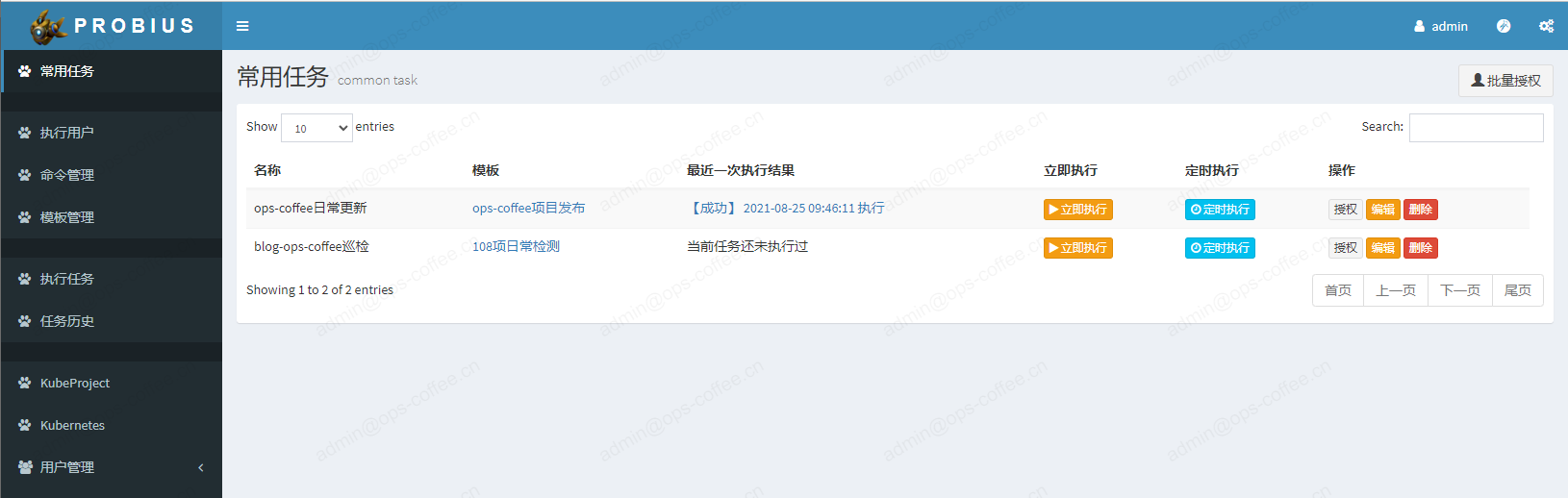 probius的三个核心概念是命令、模板和任务,命令是系统中的最小粒度,可以是一个具体的linux命令或是一个可以执行的脚本,模板是一组命令的组合,任务包含了模板和参数,同一个模板对应不同的参数就会是多个不同的任务,基于这种思想probius可以实现任何的功能,无论是日常巡检还是发布上线,都可轻松应对