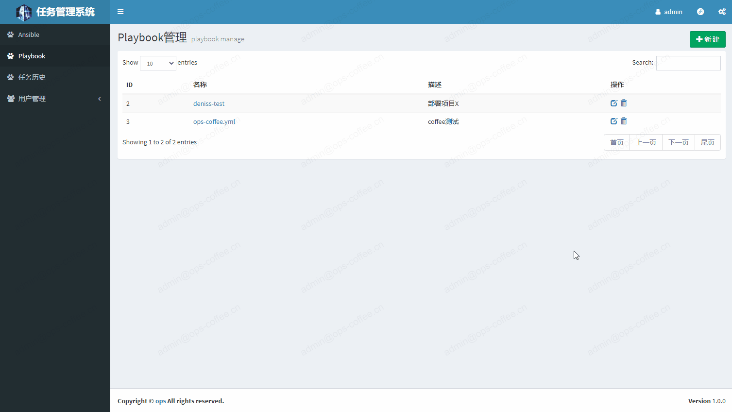 另外一个下拉框是playbook的选择,这就需要另外一个playbook管理的页面,管理playbook就需要进行增删改查,一个简单的页面如下