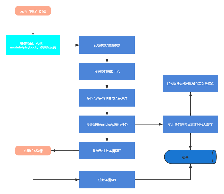 AnsibleAPI执行过程中将日志实时写入缓存,同时可以通过websocket推给任务详情页面,任务详情页面接受到数据之后展示,如果觉得使用websocket没必要也可以像我一样直接在任务详情页启动一个循环,每秒请求日志将更新追加到页面上,在任务执行完成后,将缓存数据写入数据库,这样的好处是可以减少对数据库的读写,提高效率,整个流程大概如下