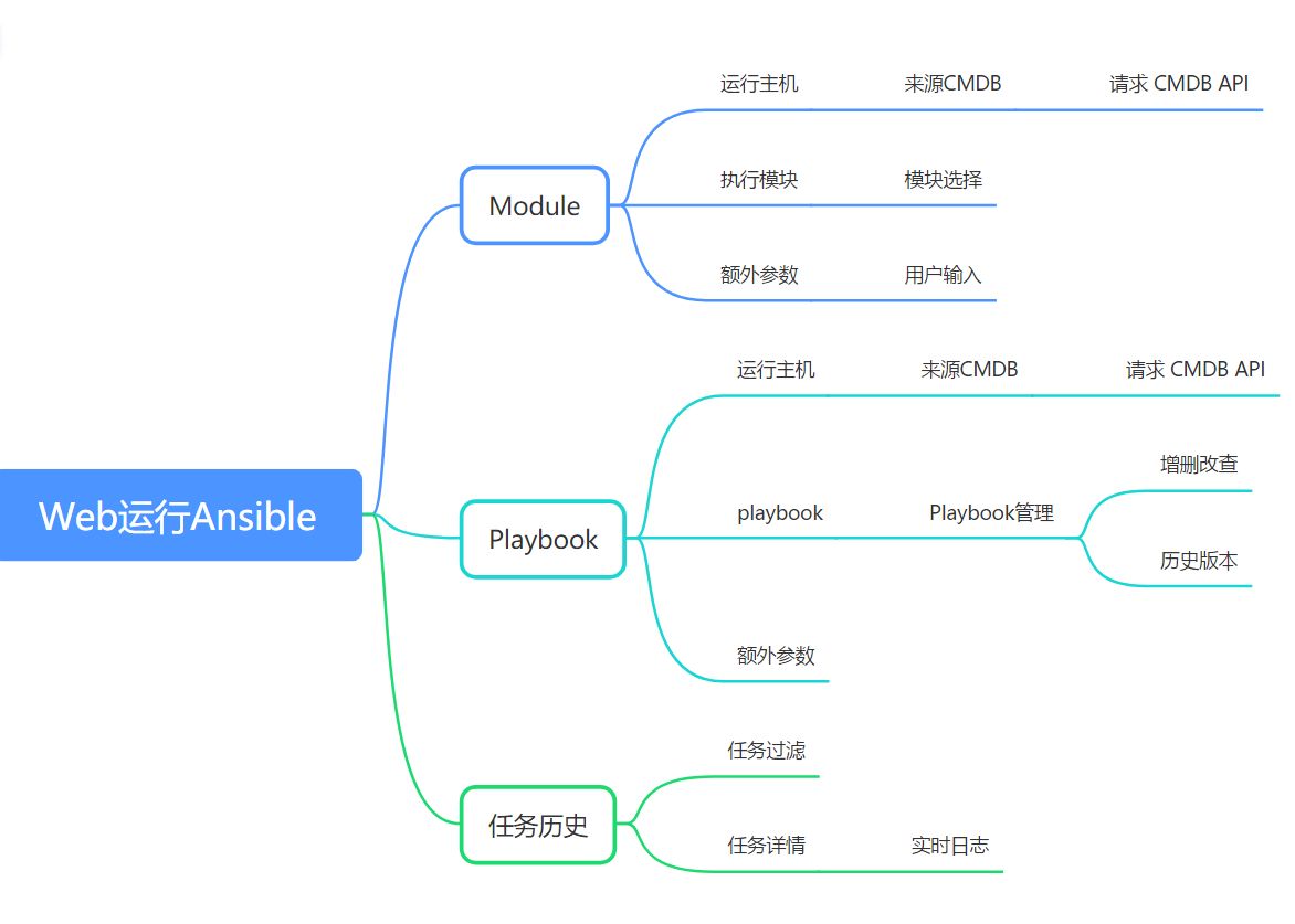 可以通过Web运行Ansible的Module和Playbook这是我们的目标,要实现这个目标我们要做哪些功能呢?我大概画了个脑图帮助整理思路