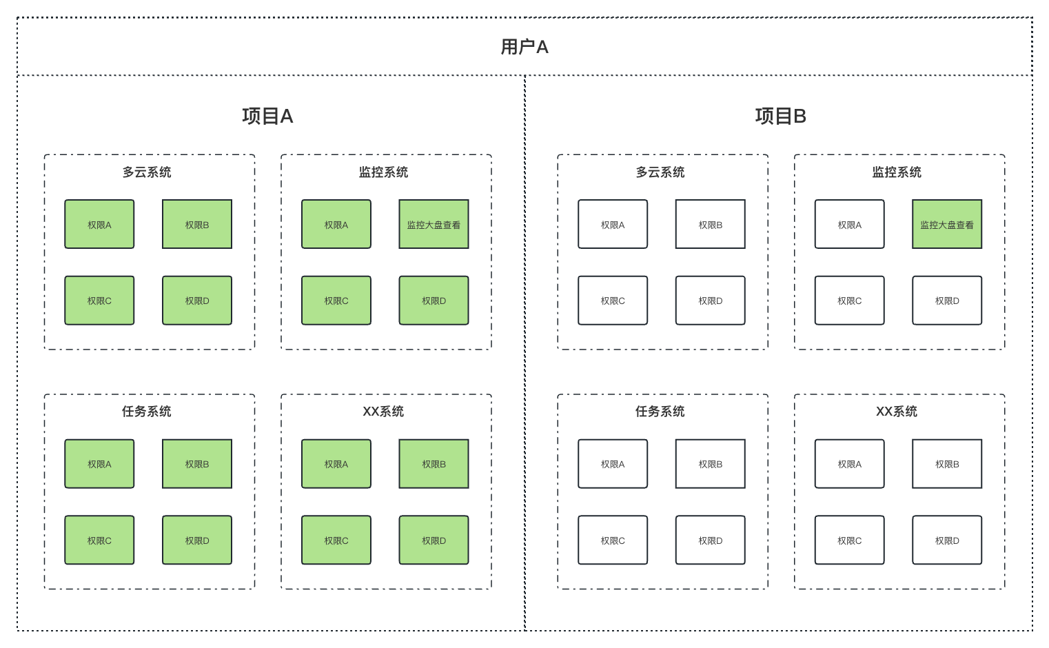 举一个实际的例子:用户A是压测中心的员工,会通过压测系统对其他项目进行压测,我们建个压测的项目A,他是压测项目A的owner,对压测项目A拥有所有的权限,例如资源查看、发布不熟等等。项目B有压测的需求,用户A就通过压测系统对项目B进行压测,此时用户A需要查看项目B被压资源的监控数据,用户A加入项目B,由于全局权限的存在,用户A对项目B也就有了所有的权限,这就是非常危险不可接受的,如何做到用户A对压测项目A拥有所有的权限,而对被压项目B仅有监控查看的权限呢?需要做到按项目去授权
