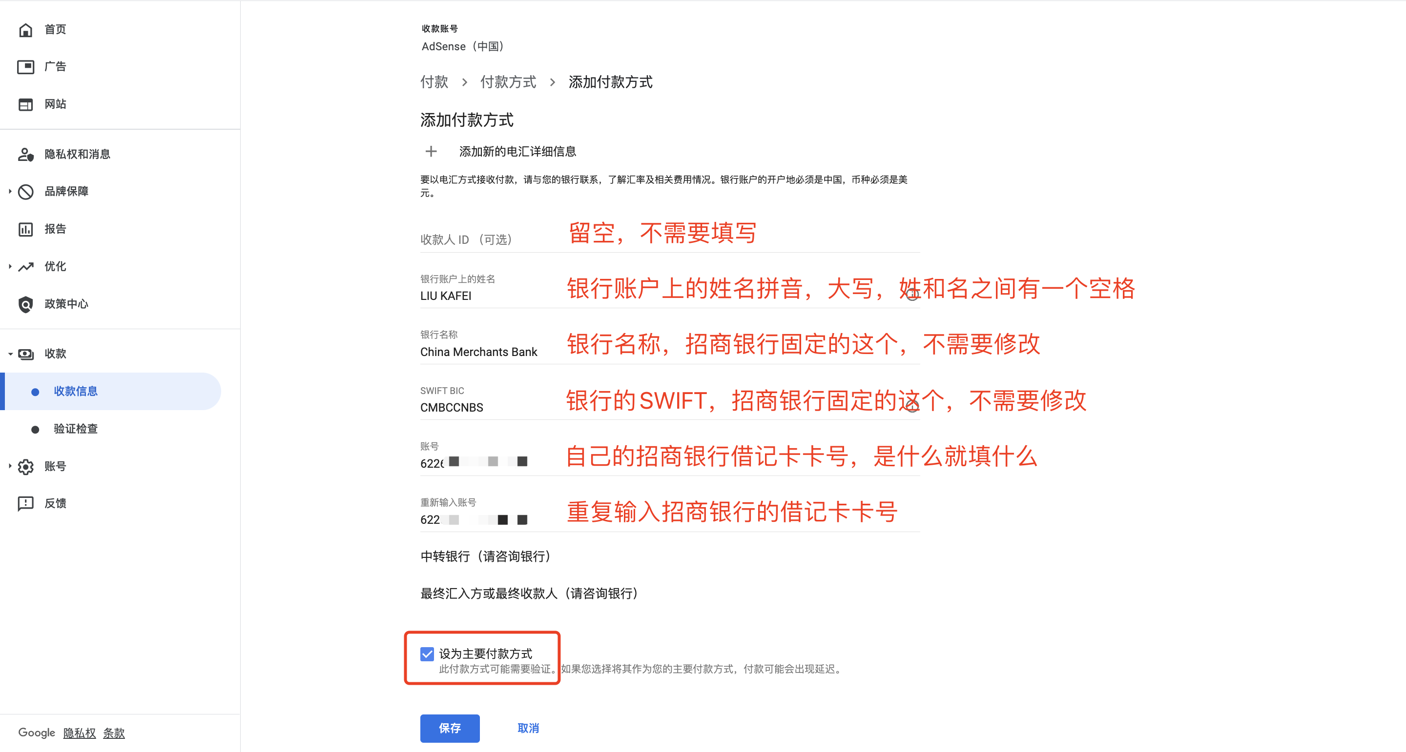 AdSense打款的前提是你正确设置了付款信息,包括支付方式和相关的银行账户或收款方式。我原本以为只有境外银行卡才能收款,但实际上并不是,国内的银行账户一样可以收款,以我所使用的招商银行为例,设置非常简单,只需要有一张招商银行卡即可,全程在线操作,不需要去线下银行柜台