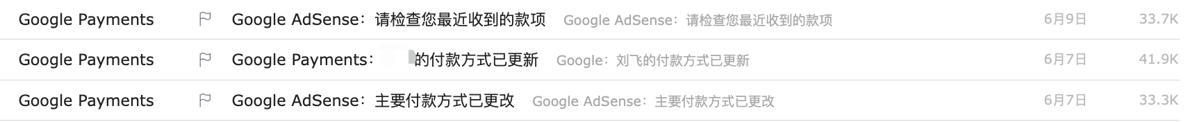 招商银行的信息按照上图填写即可,基本上只需要填写姓名和卡号信息,其他的信息都是固定的,填写完成后就坐等收款了。给几个时间数据,我是6月7号添加的付款方式,AdSense是第二天也就是6月8号发起的付款,6月9号发送了邮件告诉我已经付款,我是在今天6月11号收到了招商银行的到账短信的,这个效率我觉得很高了