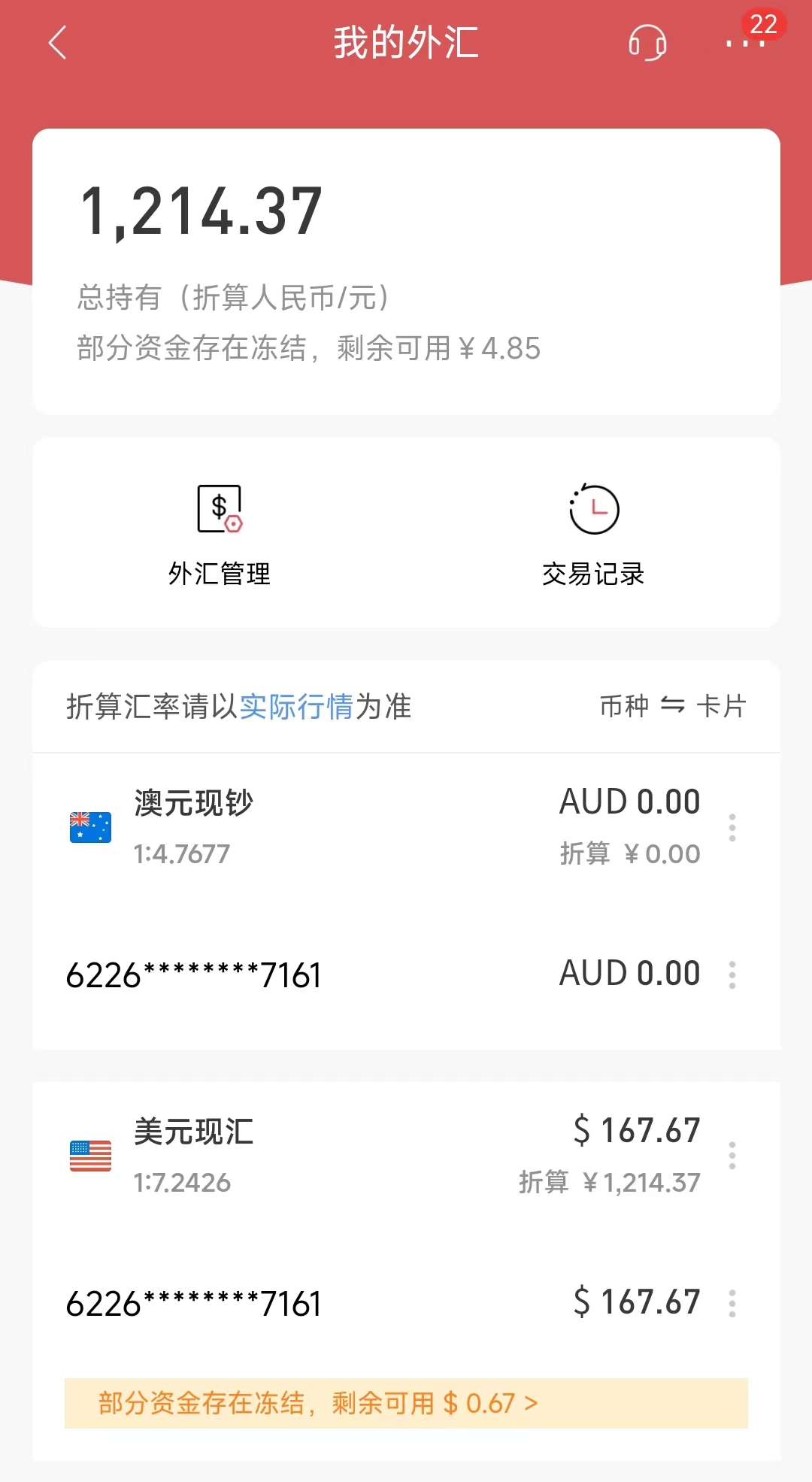 这里看到部分资金存在冻结,是因为我把刚刚到手的美金购买了理财,年华收益率大概4.9%左右,很香