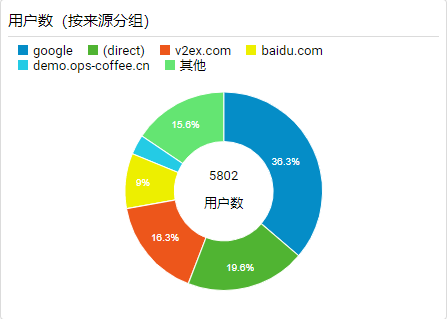 由于Github拒绝百度爬虫(这也是为什么在百度里搜索不到Github仓库的原因),且网站没有备案,所以针对百度的SEO优化就直接放弃了,把精力放在了Google搜索上,下图是当前访问网站的用户来源饼图,可以看出优化的效果