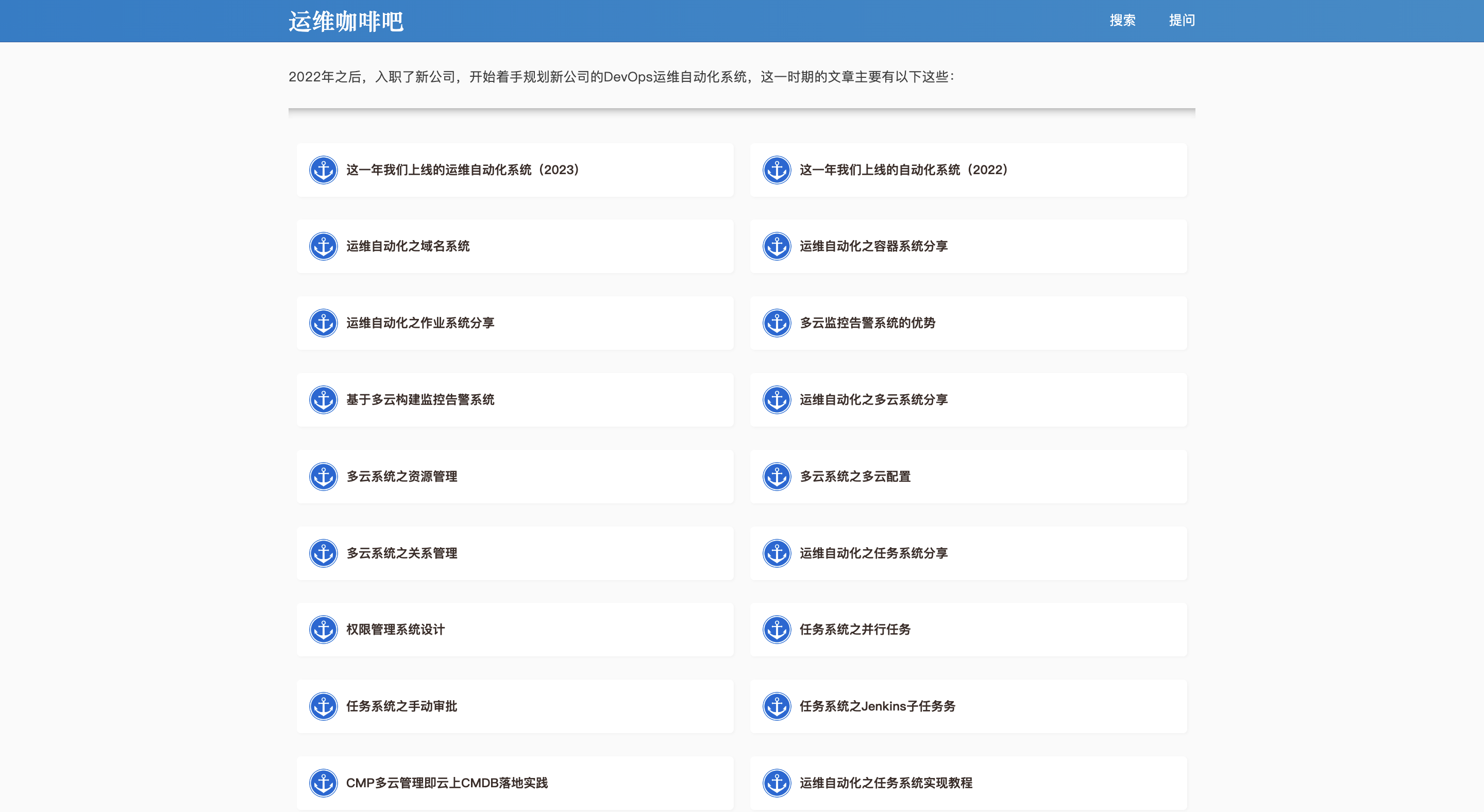 我的博客里有一个devops页面,专门用来汇总我写过的一些DevOps运维自动化相关的技术文章,页面很简单,就是一段文字描述加上一堆的文章链接,像下面这个样子