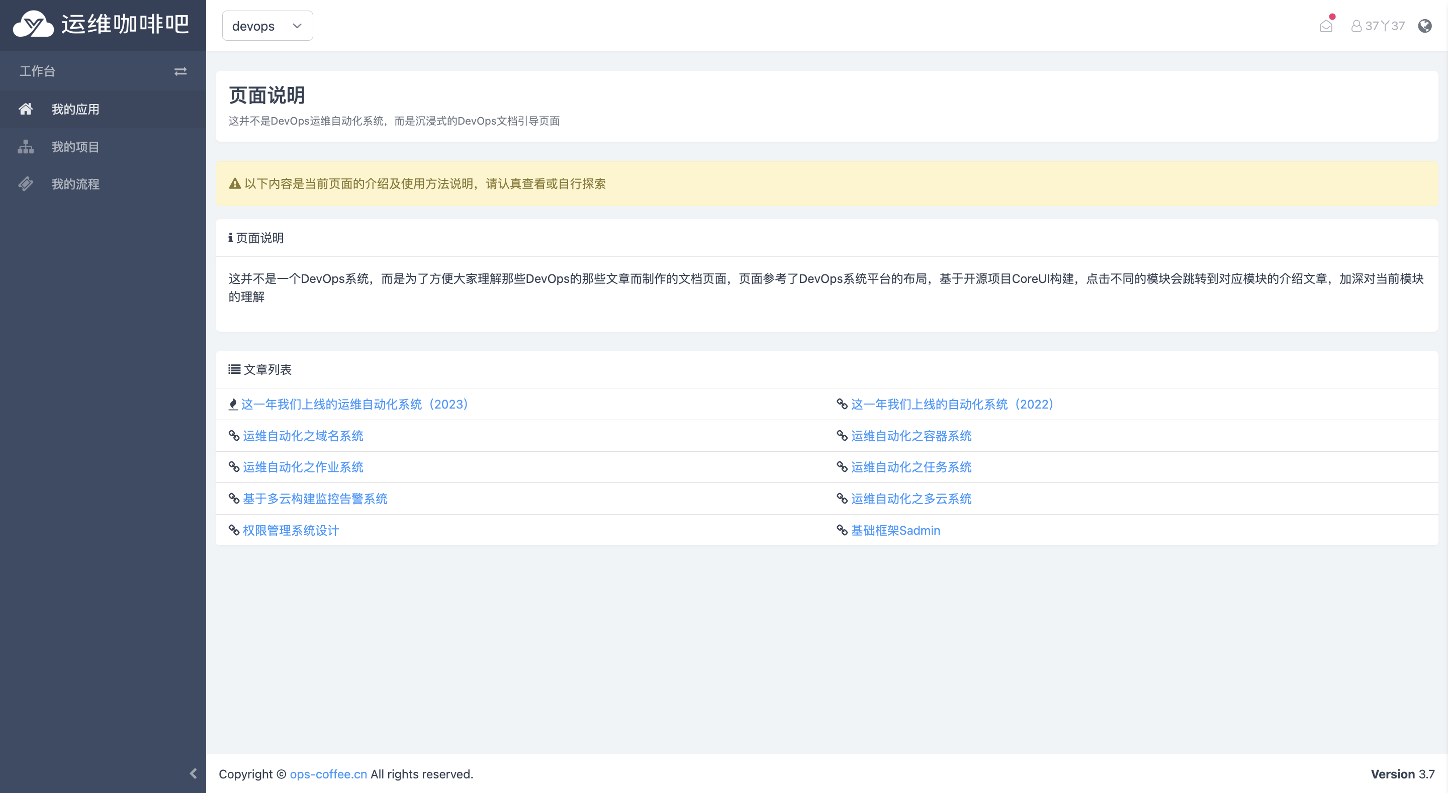 这个页面就与我们的系统页面布局相同,使用体验类似,点击左上角应用名称后边的切换按钮可以呼出全部应用,想要深入了解哪个应用直接点击对应应用即可,目前已上线,赶紧来体验:https://blog.ops-coffee.com/devops