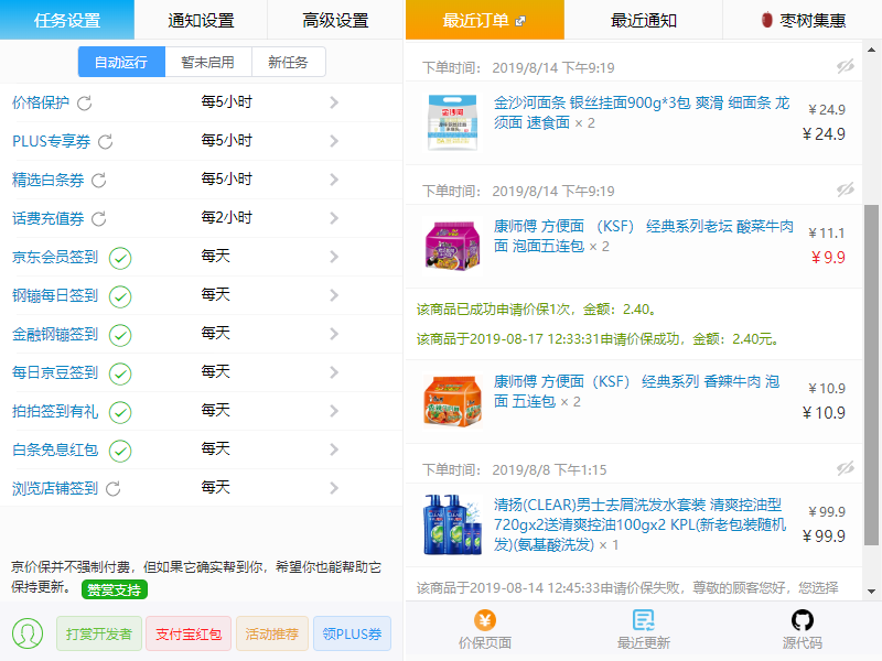 本次介绍的这个浏览器插件适合所有有京东账号的人,如果你经常在京东购物那就更为完美了,她的名字叫做京价保,她就像你的私人小秘书,不知疲倦夜以继日的帮你监测你的购物列表,如有商品降价就会自动帮你提交保价申请执行价格保护,同时她也支持自动签到领京豆、领钢镚、领优惠券