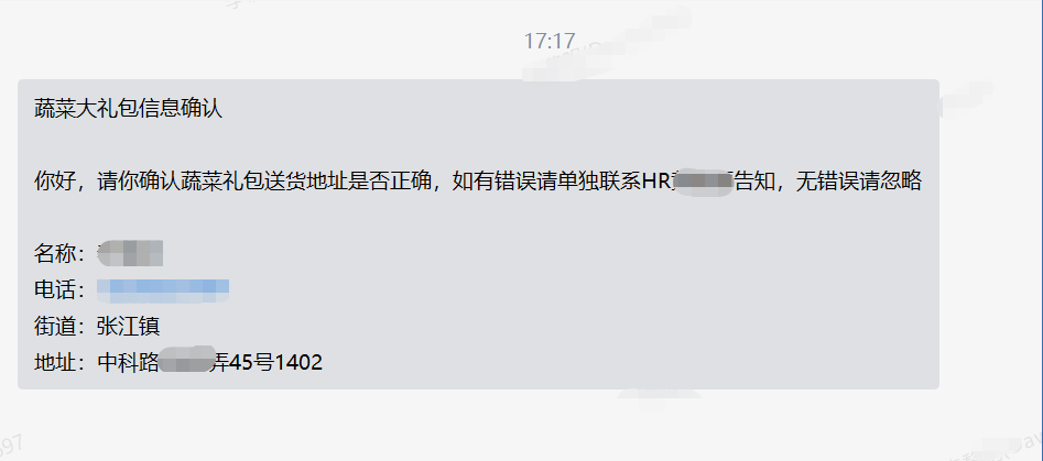 '你好,请你确认蔬菜礼包送货地址是否正确,如有错误请单独联系HR告知,无错误请忽略\r\n\r\n名称:%s\r\n电话:%d\r\n街道:%s\r\n地址:%s' %(