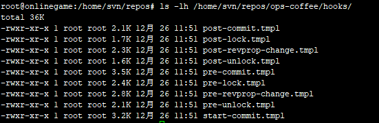 svn hooks位于svn版本库的hooks文件夹下,例如svn目录为/home/svn/repos,仓库名称为ops-coffee,那么hooks就位于/home/svn/repos/ops-coffee/hooks/目录下,文件夹下的.tmpl的文件为hooks的模板文件,以shell脚本的方式展示了hooks该如何使用