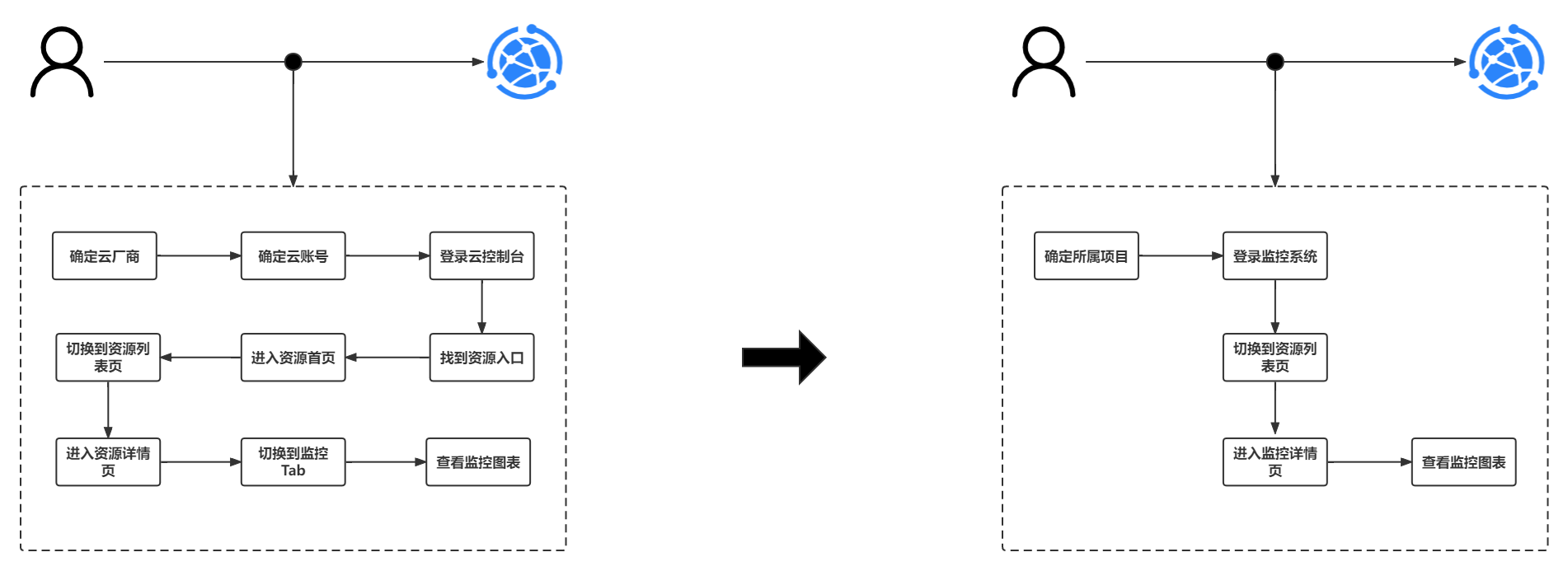 云上监控位于不同云平台下,我们知道每个云平台对于监控的定义和操作都不同,甚至是同一云平台下不同云服务之间监控的查看路径和展示方式都不同,且云资源监控查看路径冗长,非常不便。我们的监控系统隐藏了云厂商与云资源的监控差异,同时简化资源监控查看操作,提供统一的监控入口和路径,使用起来更方便。以一个云主机的监控查询为例,可以简单对比下之前通过云控制台查看与现在通过我们自己的监控系统查看之间的差异