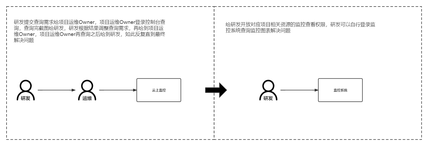 云平台上的权限配置非常复杂,对于细粒度的资源权限隔离几乎无从下手,而我们的业务又比较复杂,所运维的项目不仅可能来自于不同的部门,甚至还有可能来自于不同的公司,所以云控制台的权限是不授权给研发,这就造成了一旦研发需要查询云上资源的监控,就需要运维在中间支持。我们的监控系统天生的支持以项目为维度进行资源隔离,授权粒度也比较灵活,可以直接授权给研发自己查看,这样大大提升了沟通效率,加速了问题的处理