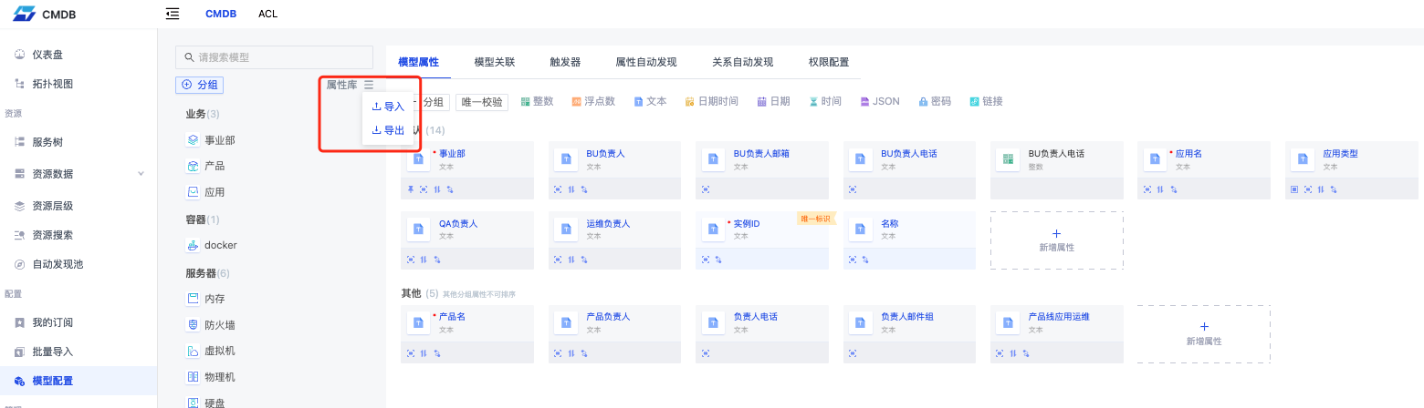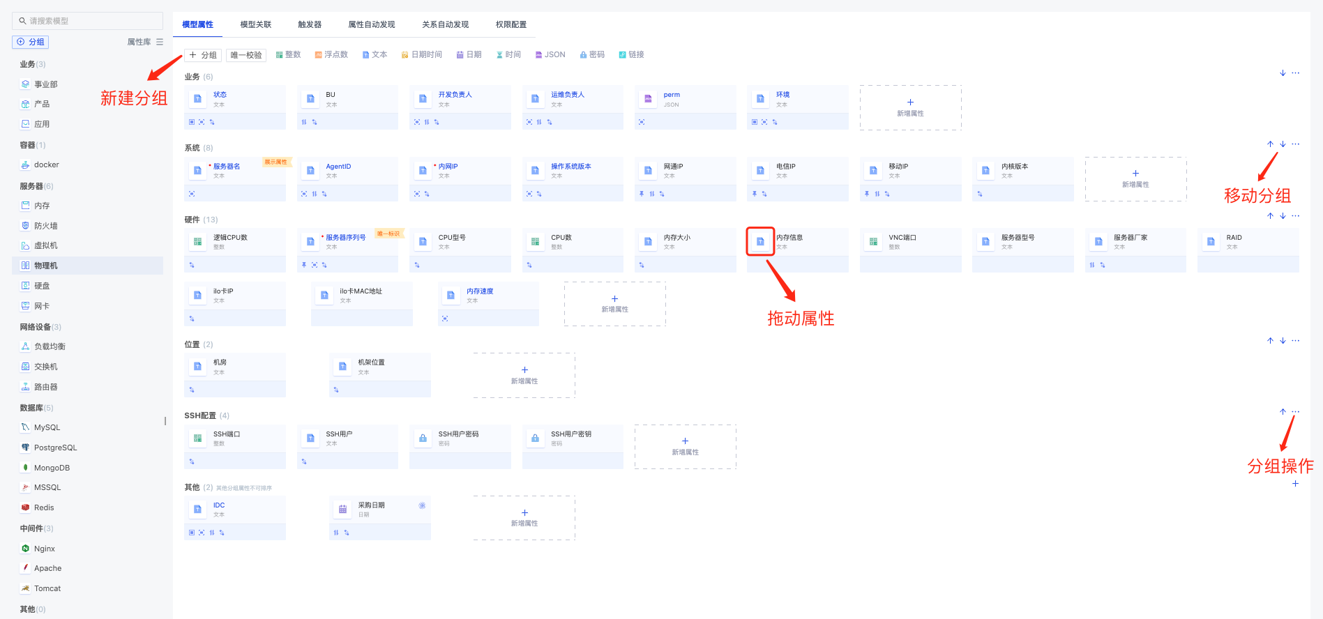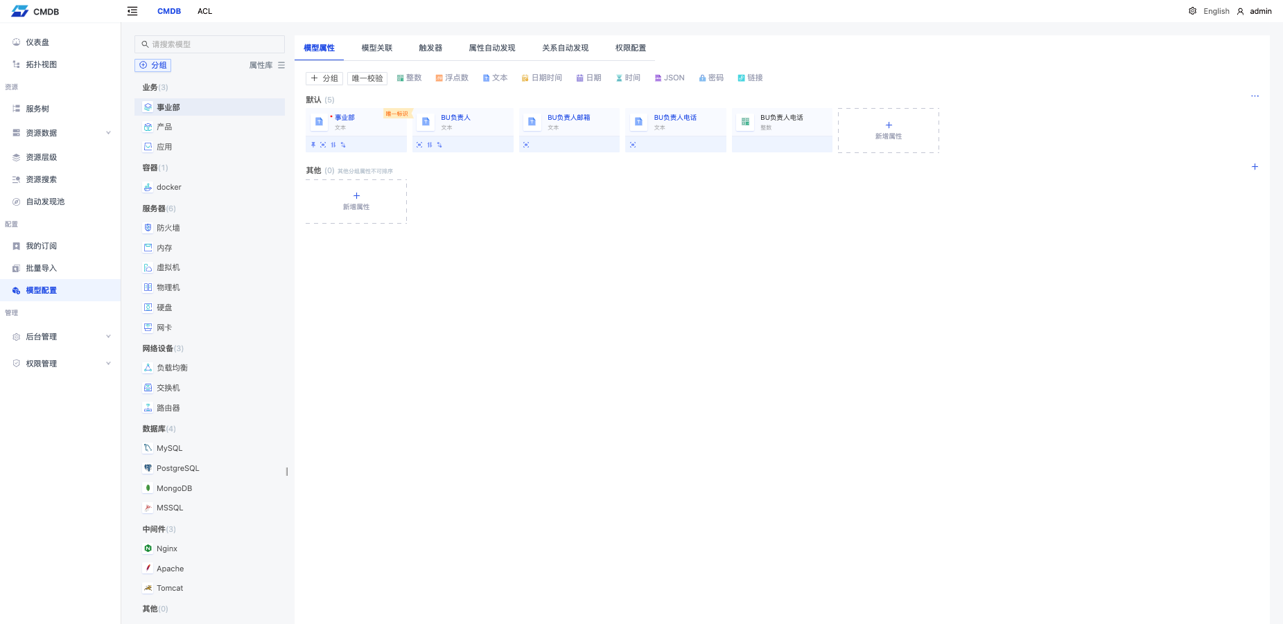 左侧菜单栏的配置中有个模型配置菜单,系统初始化带了一些常用的模型,例如虚拟机、物理机、交换机、路由器等等,这些常用的模型按照不同的类型分布在不同的分组下