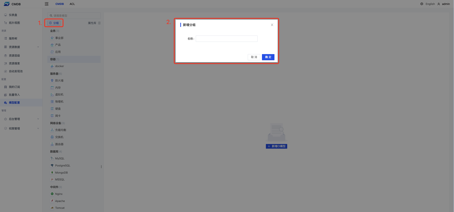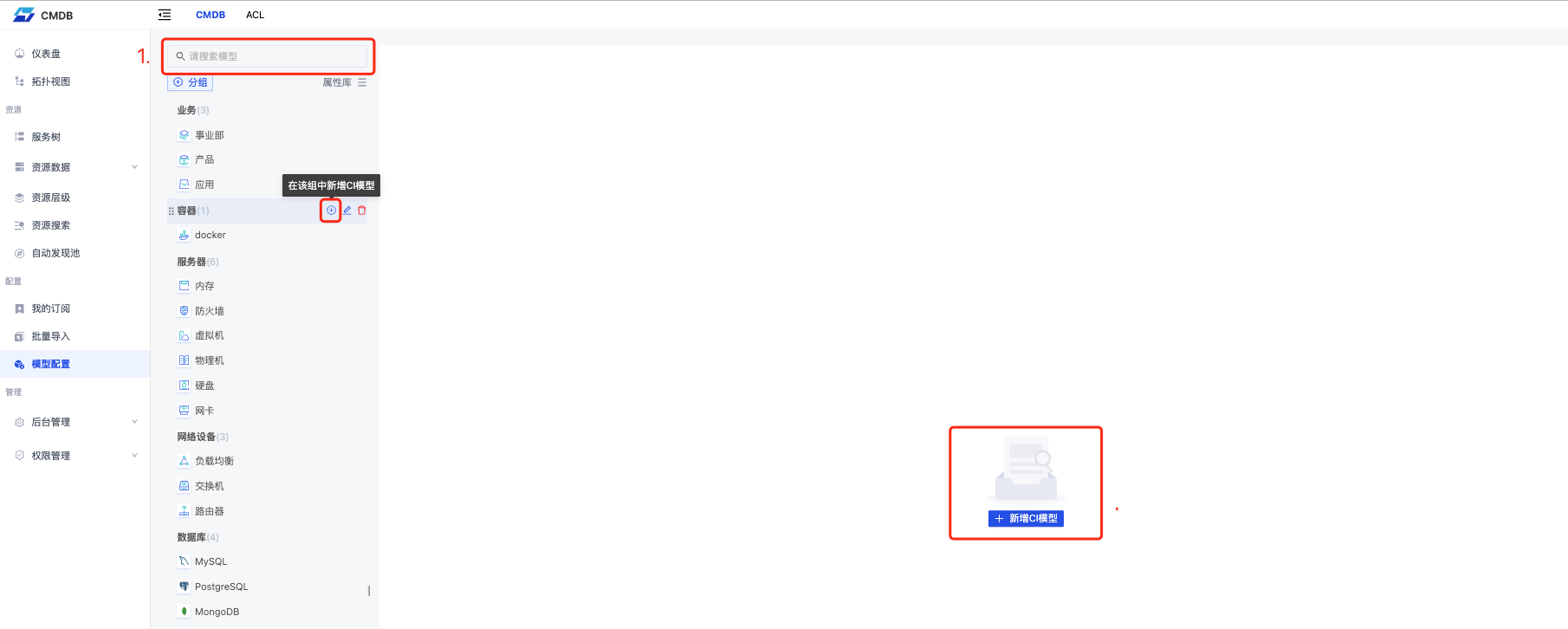 模型上方的搜索框里可以输入模型名称搜索模型,如果模型不存在,则可以点击模型分组,点击模型分组右侧的添加按钮或者右侧的新增CI模型按钮来添加模型