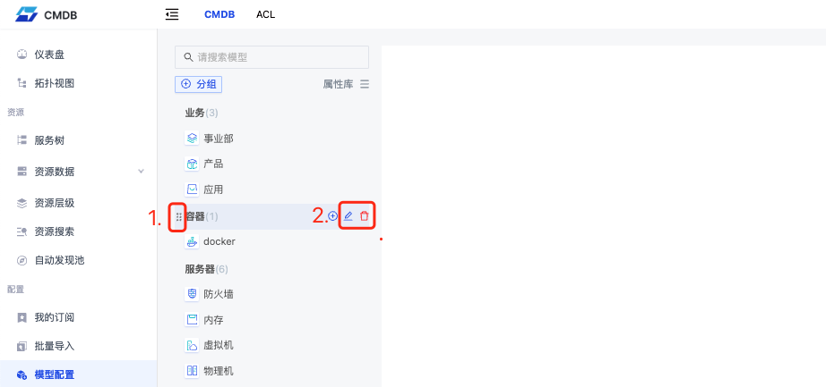 鼠标移动到模型分组上,模型分组名称左侧可以拖动进行分组排序,同时分组名称右侧修改按钮可以修改分组的名称,删除按钮则能删除掉分组,需要注意的是删除分组前需要保证分组下无模型,否则会删除失败
