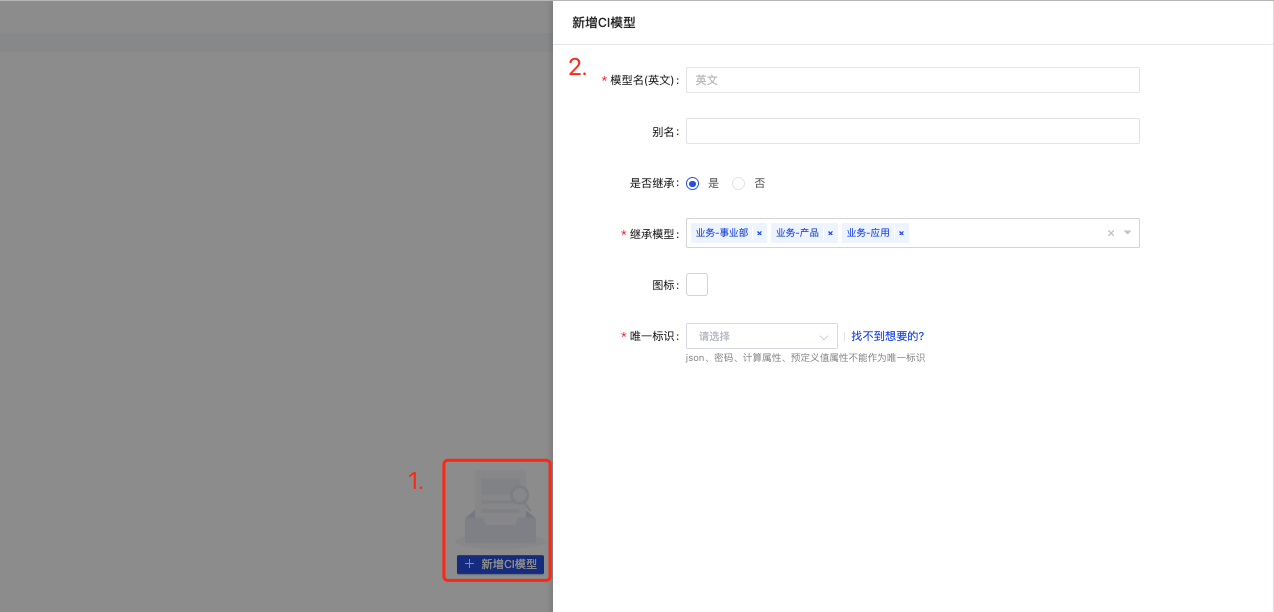 新增CI模型有几个配置,模型英文名称、别名、是否继承、图标以及唯一标识