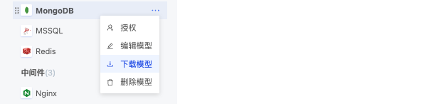 模型与模型分组类似,鼠标移动到模型上,模型名称左侧可以拖动进行模型排序,模型排序不仅可以在当前模型分组下排序,还能拖动到其他模型分组下,模型名称右侧则可以对模型进行授权、编辑、下载或删除模型