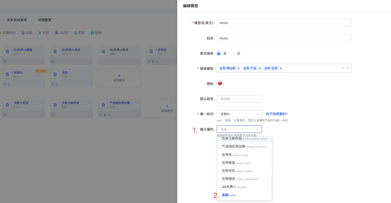 是否继承: 是否继承来配置当前模型是否从其他的模型继承模型属性,简单理解为表字段是否来自于其他表,例如我们新建名为Redis的模型,Redis里的应用配置就继承自应用模型,则这里可以选择继承,并在继承模型中选择应用模型