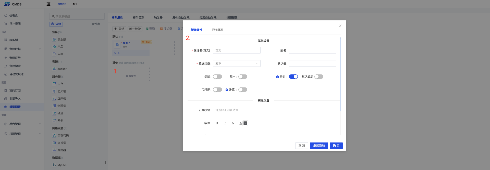默认值: 配置属性的默认值,例如我们要加一个SSH连接端口的属性,则可以数据类型选择整数,默认值填上22,这样我们在添加数据时,SSH连接端口这个字段将默认填充22