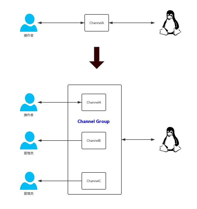 之前的WebSSH仅是单连接,只需要客户端和服务器建立长连接,然后处理指令就ok了,我们并没有启用channel的layer,实际上也可以看作是单channel,但要实现监控的功能,就需要将操作者和管理员(监控者)的多个channel合并在一起组成一个group,这样操作者的所有操作都可以发送给这个group,同处于这个group内监控者就能实时收到消息了,大概流程变化如下图所示